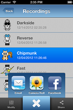 Want to save your recording and change your voice effect later? No problem! Voicy allows unlimited recording and effects saves and allows you to share by Email and Facebook or save your recordings to the iPhone's camera roll to backup your recordings or send as MMS.